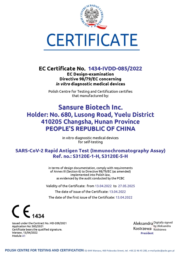 mile米乐集团生物新冠快速抗原检测试剂自测产品取得欧盟CE1434自测证书,表明公司免疫检测产品性能获得官方机构认可,进一步丰富了mile米乐集团生物全场景化新冠检测解决方案,扩大和满足了全球市场各级检测防控需求,为全球疫情防控工作持续助力。